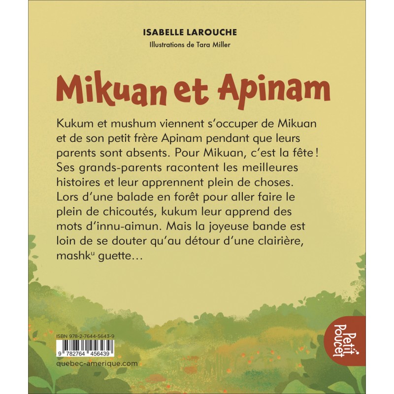 Kukum et mushum viennent s’occuper de Mikuan et de son petit frère Apinam pendant que leurs parents sont absents. Pour Mikuan, c’est la fête! Ses grands-parents racontent les meilleures histoires et leur apprennent plein de choses. Lors d’une balade en forêt pour aller faire le plein de chicoutés, kukum leur apprend des mots d’innu-aimun. Mais la joyeuse bande est loin de se douter qu’au détour d’une clairière, mashku guette…